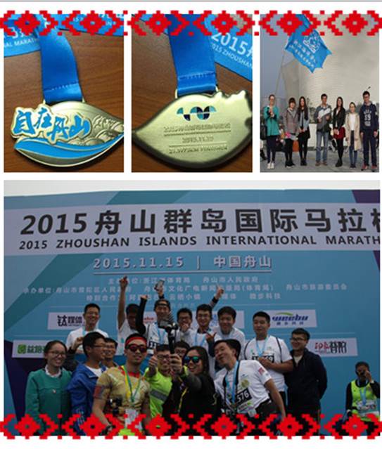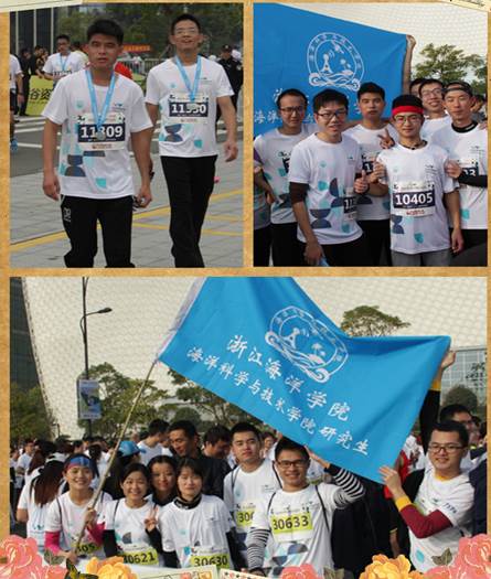 2015年11月15日,由浙江省体育局、舟山市人民政府联合主办,舟山市普陀区人民政府、舟山市文化广电新闻出版局(体育局)、舟山市旅游委员会联合承办的2015舟山群岛国际马拉松竞赛在舟山市普陀区开跑。本次赛事以“生态·智慧·健康”为主题,以“自在舟山智慧跑”为口号。大赛设置有半程马拉松、迷你健身跑等项目,共有来自美国、日本、台湾、香港等15个国家和地区的5372人参加。我院积极组织学生参加,并统一为学生安排体检、进行安全教育及提供后勤保障。在学院动员和组织下,共有17名研究生和4名本科生参加了本次活动,而且21人全程跑完,无人中途放弃。
